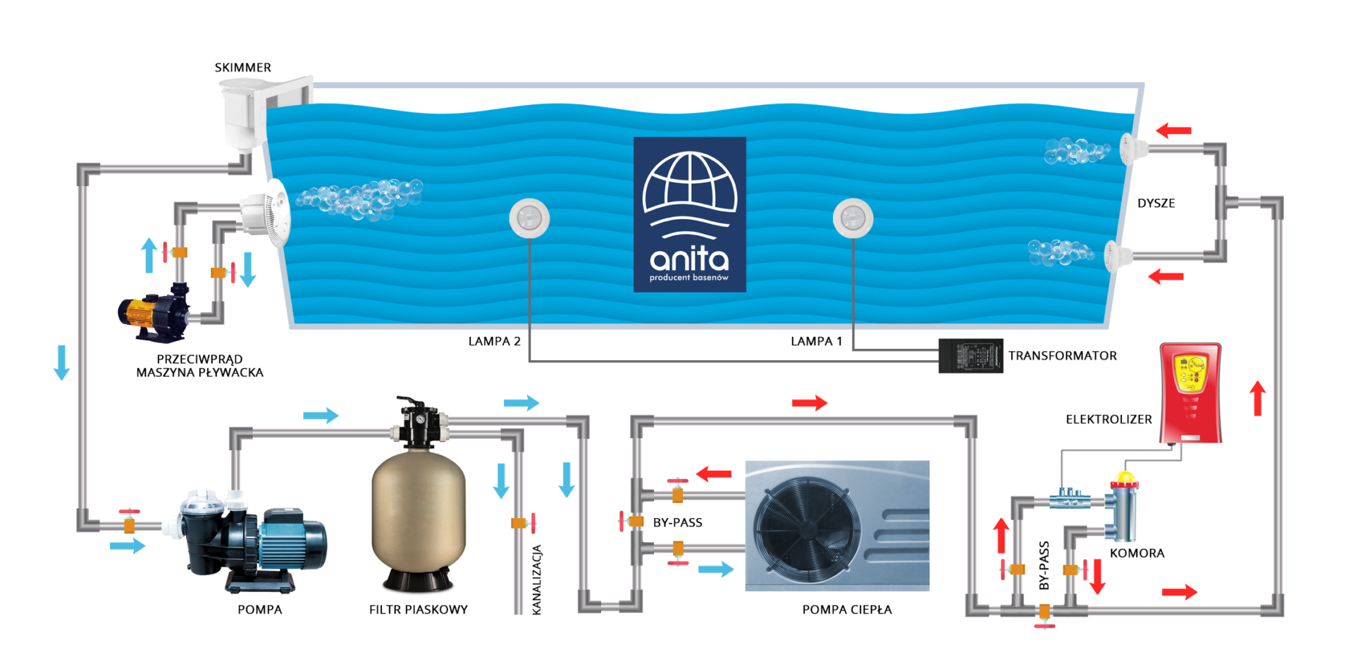 - Aby uzyskać jak najlepszy efekt oczyszczania (cyrkulacja), należy zamontować wloty po przeciwnej stronie komory przelewowej (skimmer).