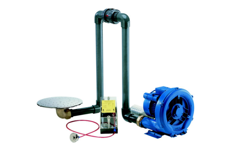 The pump presses air into the lid with many holes, through which it exits as bubbles into the water, giving a great effect. The pipeline must have an air loop which protrudes above the water level. The final set of the device includes a PN button, control, 230 V, 1.1kW pump, check valve and cover.