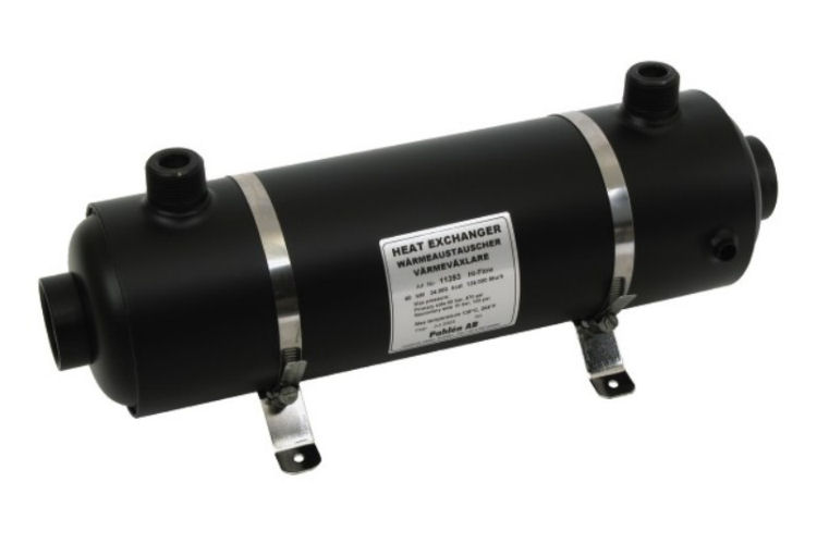 The heat exchanger is mounted on the pool water system. The principle of operation is simple and effective. C.H. hot water flows into the exchanger through a coil inside. The water from the pool, flowing around the coil, is heated.
