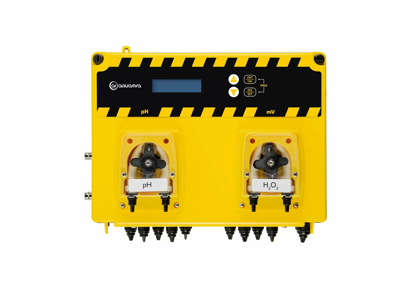 Aquaviva pH+H2O2 peristaltiska doseringspumpsystem analyserar pH-elektrodindex. Baserat på dessa index doserar pumpen automatiskt reagenser i önskat förhållande. Detta säkerställer konstant pH-kontroll utan mänsklig inblandning. Proportionell dosering utförs i Pro Band-läge och kontinuerlig dosering utförs i ON/OFF-läge.