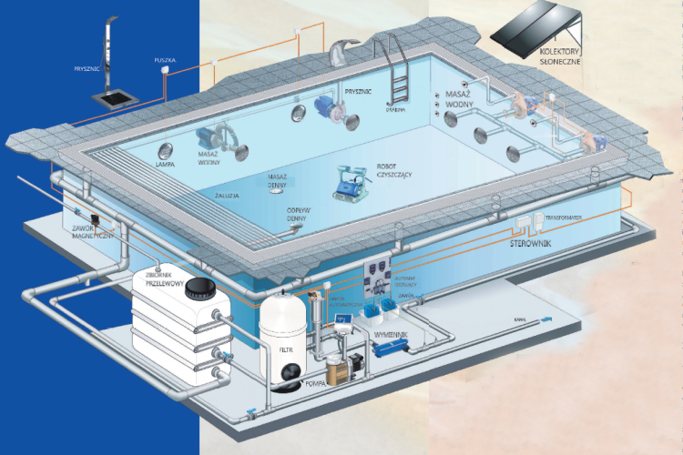 Figuren visar en pool med en överflödsränna. Detta är den vanligaste typen av pool på hotell och andra offentliga anläggningar. Vatten rinner jämnt i rännan från poolens hela yta. Genom rännan som visas på ritningen rinner vattnet genom uppsamlingsröret till överflödestanken. När vattnet i tanken når en viss nivå suger filterpumpen vatten från tanken. Allt styrs av fem elektroder och en drivenhet. De mäter den aktuella vattennivån i tanken.