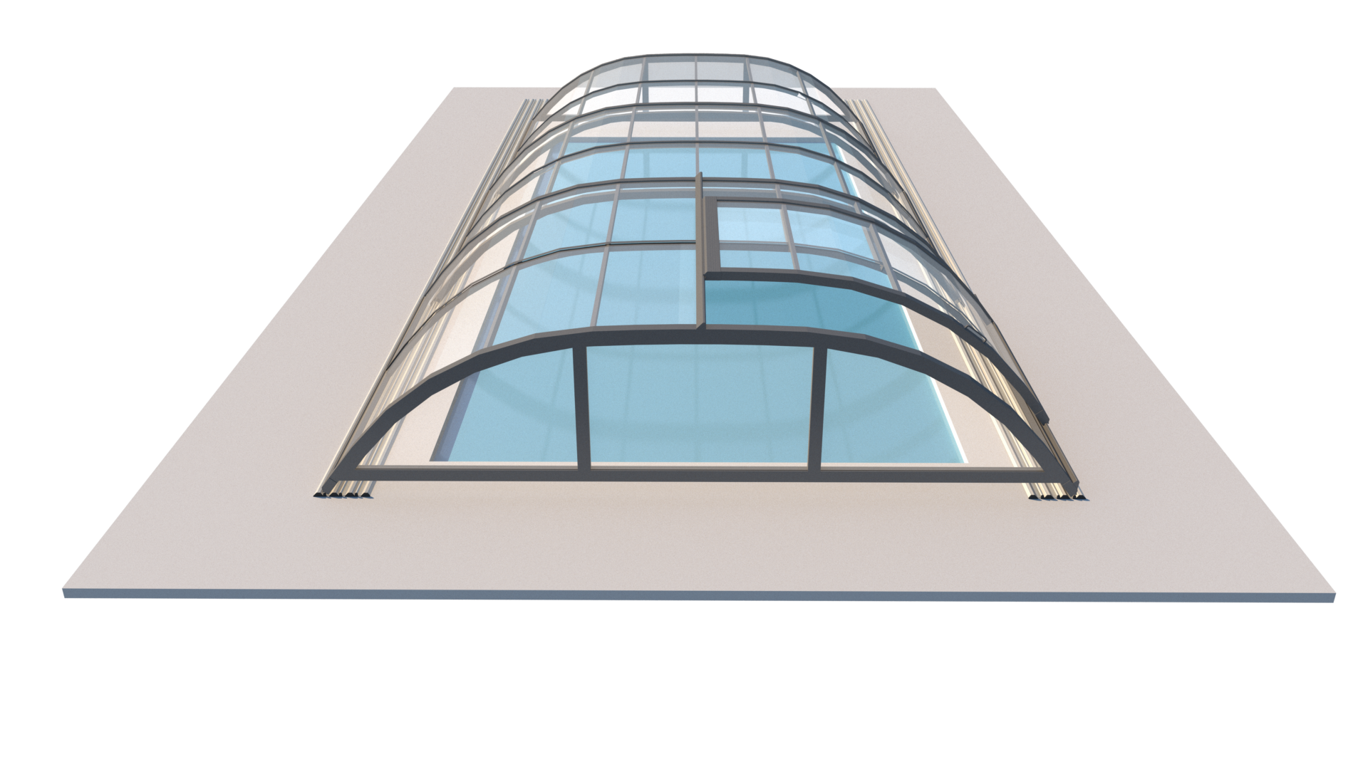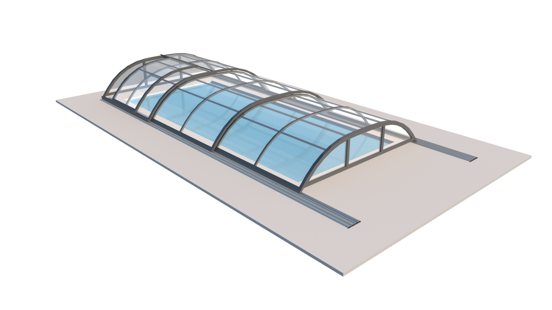 Animationen visar modulerna som glider på specialdesignade, låga skenor. Möjlighet att flytta locket utanför poolen.