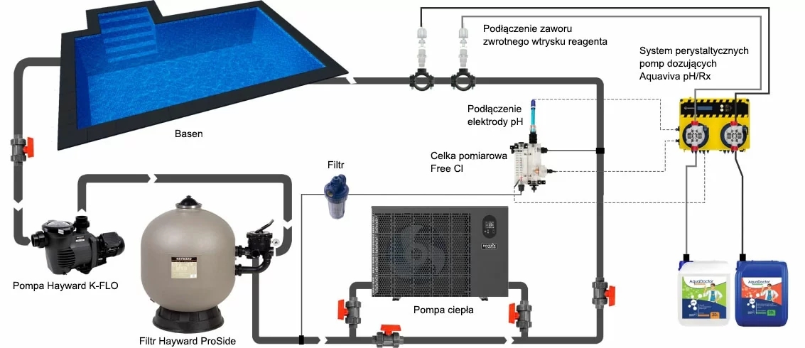 Na podstawie uzyskanych parametrów jedna z pomp automatycznie dozuje chlor, a druga – środek do zwiększania lub zmniejszania pH w wymaganych proporcjach. W ten sposób zapewniana jest stała kontrola środka dezynfekującego lub pH bez interwencji człowieka. Wysoka jakość wody w basenie pozostaje stabilna, nawet w przypadku zmiany czynników zewnętrznych: aktywność słoneczna, deszcz lub wzrost liczby pływających osób.