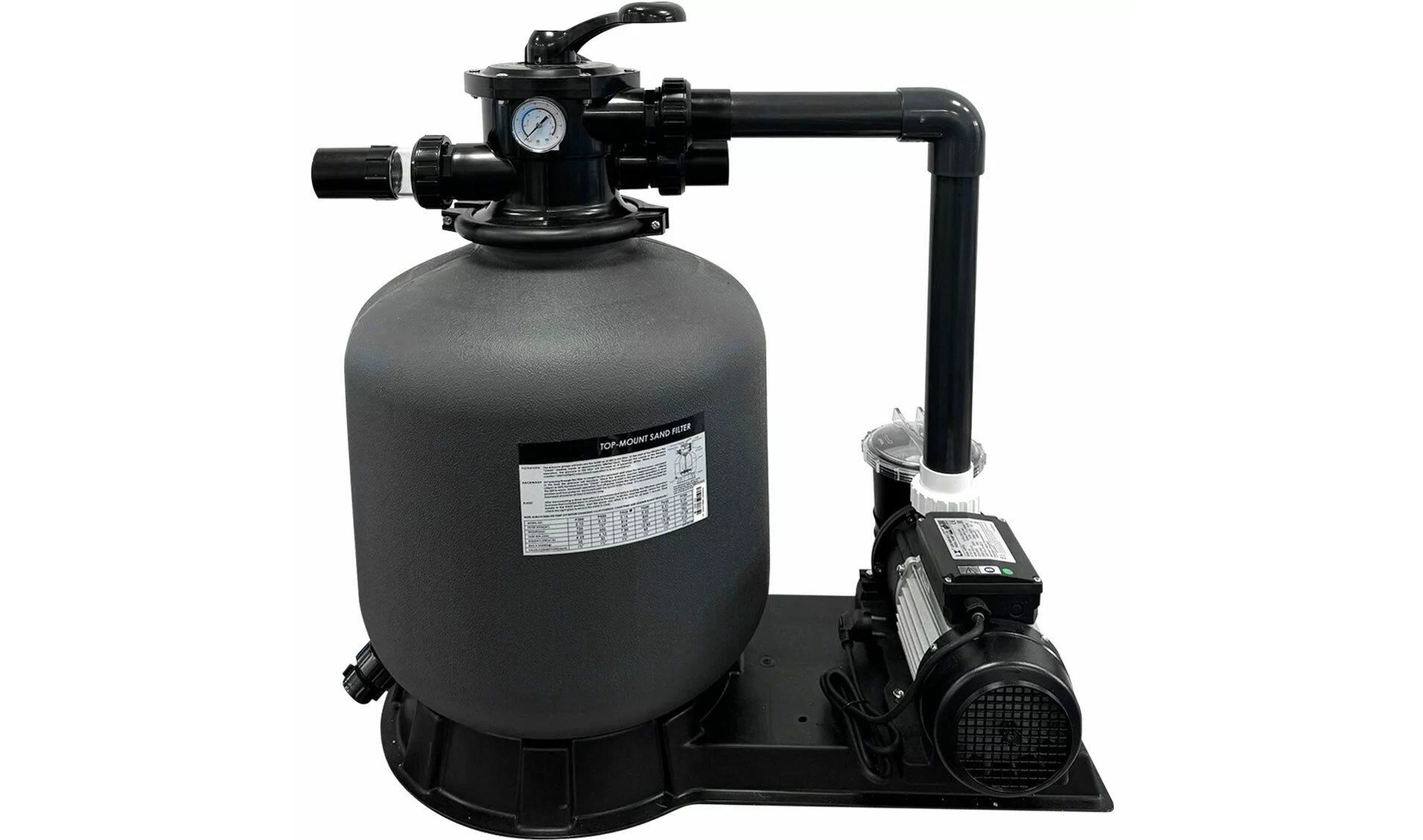 Obudowa filtra wykonana jest z polietylenu o wysokiej wytrzymałości, a obudowa pompy z tworzywa termoplastycznego. Zestaw wyposażony jest w zawór 6-trybowy, manometr i złącza uniwersalne.